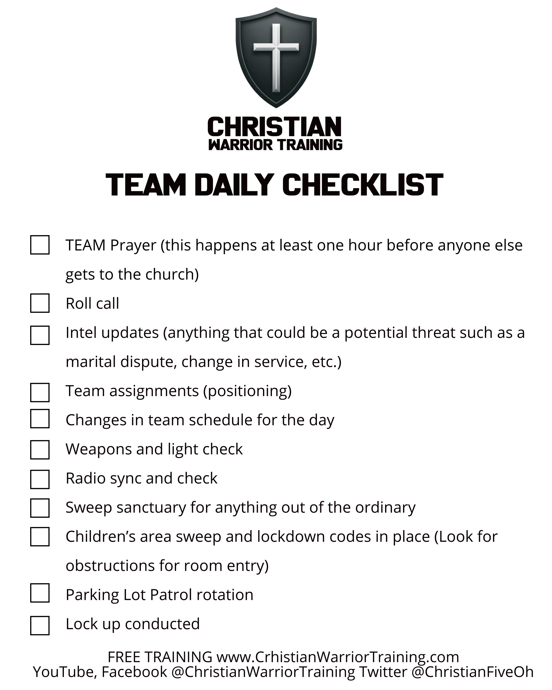 Conclusion: Your church security team diligence and preparedness are the backbone of a safe worship environment. The Team Daily Checklist is a comprehensive guide to ensure that no aspect of church security is overlooked. Download it now to enhance your team's effectiveness and ensure peace of mind for your congregation.