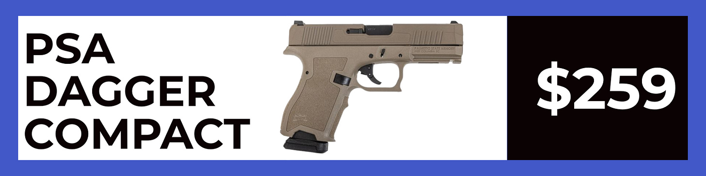 Palmetto State Armory makes a Glock 19’ish handgun called the Dagger Compact. I own one and have found that it is exactly like the Glock it mimics, except for the trigger. The trigger is like a Smith and Wesson trigger. I know funds can be tight, but if you are looking for a carry gun for church or just to practice your ABC’s, I would go with this. Matt over at 2A Cops and I did a budget gun test and this one came in #1 in our opinion. At $259, you can’t beat what you get for the price. I saw this on sale and felt that I needed to give you a heads up. It’s the cheapest I’ve seen.