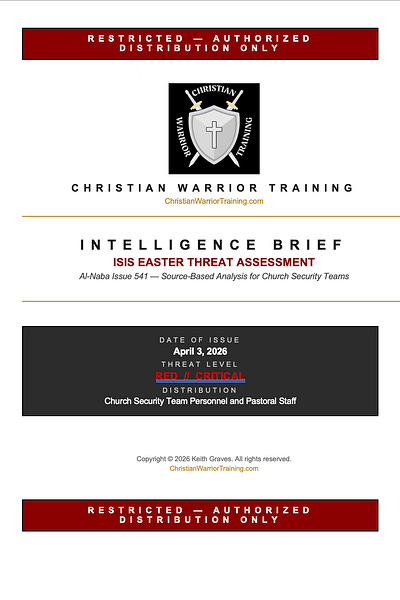 The current threat posture for American churches is RED. That assessment rests on three compounding factors: an explicit ISIS directive to attack Jewish sites released 48 hours before Easter Sunday, with a surrounding newsletter documenting ongoing ISIS attacks against Christians; al-Qaeda’s simultaneous release of bomb-making guidance through Inspire; and the highest single-day church attendance period of the year. The primary threat is not an organized cell. It is the individual who has been consuming this content online and reads the al-Naba call as personal religious authorization to act. Michigan congregations carry additional exposure given the local attack pattern. The overall posture should be: alert, calm, deliberate, and prepared.