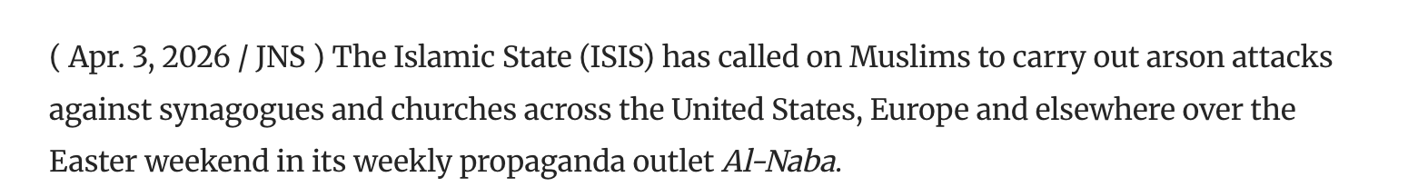 ISIS published an operational call in its official al-Naba newsletter (Issue 541, April 3, 2026) ordering followers to set fire to Jewish synagogues across America, Europe, Russia, and India. We reviewed the source document directly. The specific call targets Jewish sites, tied to the Israeli closure of the Al-Aqsa Mosque. Outlets across the country have been reporting this as a call to burn Christian churches as well. That specific language does not appear in the quoted ISIS text, and we are going to walk through exactly where that claim came from. The threat to churches this Easter is real and we will explain why, but your security team deserves an accurate assessment, not a headline that got loose. Al-Qaeda’s Inspire magazine also published bomb-making content days earlier. Both threat streams are active. Treat this weekend as a heightened threat environment.