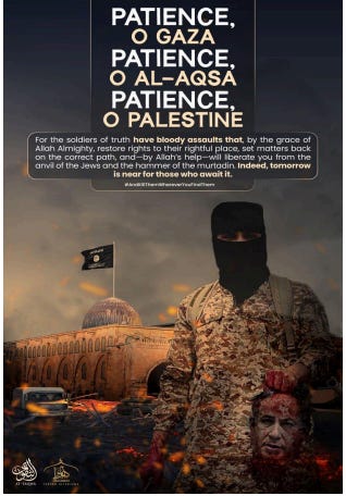 Another highly disturbing flyer from Al-Saif Media features a masked militant holding the severed head of Israeli Prime Minister Benjamin Netanyahu, displayed against a ruined Al-Aqsa mosque. The caption reads, "#AndKillThemWhereverYouFindThem," directly invoking Quranic language misused by extremists to justify violence. Though Israel is the specific political target, the symbolism is religious and aimed broadly at Christians and Jews.