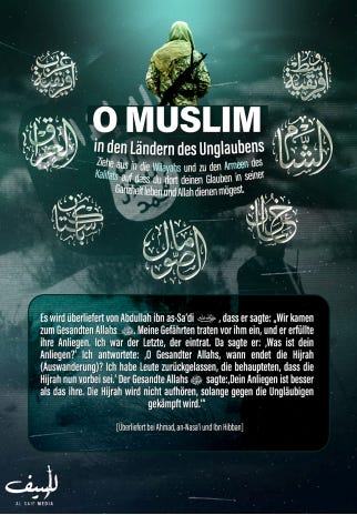 Multiple propaganda flyers and graphics distributed through IS-linked media outlets openly call for violence against the West, portraying Western nations as "lands of disbelief" and labeling Christians as legitimate targets. One flyer titled "O Muslim in the Lands of Disbelief" urges Western-based Muslims to make hijrah (emigrate) to join IS or conduct attacks in place