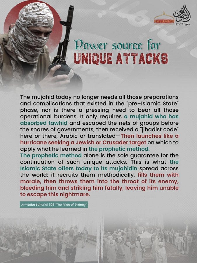 An Islamic State propaganda image and accompanying messaging are circulating online encouraging self-radicalized individuals to carry out lone-actor attacks without direct command, training, or logistical support, according to terrorism monitoring sources. The material emphasizes lowering the barriers to violence by urging individuals to act independently after consuming ideological content, explicitly calling for attacks against Jews and individuals labeled as “Crusaders.” The propaganda frames these acts as “unique attacks,” portraying spontaneous violence as both religiously justified and strategically effective, and promotes the idea that ideological indoctrination alone is sufficient to carry out lethal assaults. Analysts warn that this type of messaging is designed to inspire rapid, unpredictable acts of violence by individuals operating outside traditional terrorist networks, making detection and prevention more difficult.
