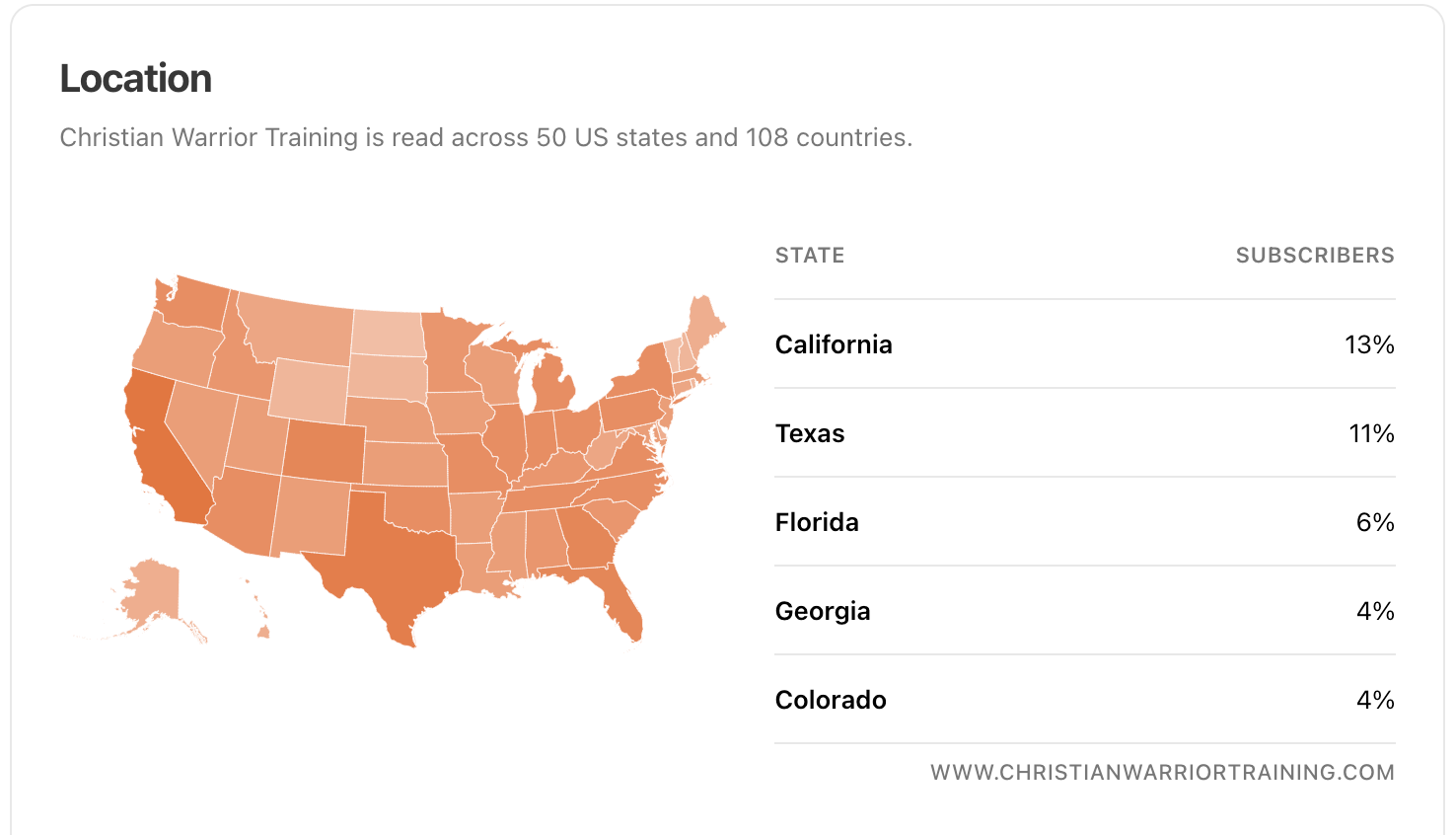 In just under 1 year, Christian Warrior Training has delivered $174,800 in free training to church safety team members from not only the U.S., but internationally as well. That doesn’t include this newsletter, which is now reaching people in every state in America. The state’s most represented are California, Texas, Florida, Georgia and Colorado.